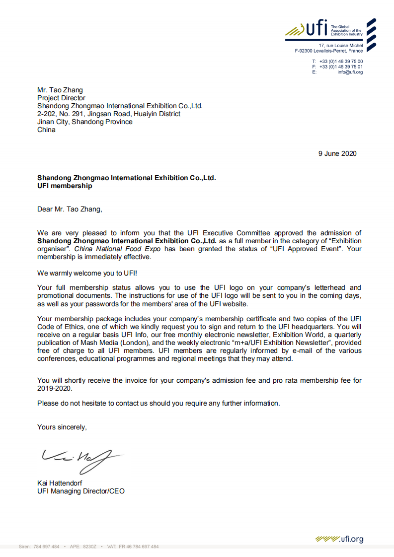 2020年6月9日,UFI(全球展覽業(yè)協(xié)會)巴黎總部傳來喜訊:中法合資高博中貿(mào)會展在山東、江蘇、安徽主辦的CNFE全國食品博覽會(濟(jì)南)、CNWFF中國(南京)國際糖酒食品交易會、CAWFF中國(安徽)國際糖酒食品交易會三展同時通過UFI(全球展覽業(yè)協(xié)會)認(rèn)證,同時高博中貿(mào)會展在山東、江蘇、安徽三個子公司也通過UFI評審委員會的表決,分別正式成為UFI(全球展覽業(yè)協(xié)會)會員單位。通過UFI認(rèn)證,是國際會展行業(yè)對主、承辦單位組織辦展能力的肯定,對展會在國際化、專業(yè)化、品牌化運(yùn)營方面的充分認(rèn)可。借助UFI認(rèn)證展會的權(quán)威和影響,努力提升展會平臺新高度,助推會展經(jīng)濟(jì)的快速發(fā)展。